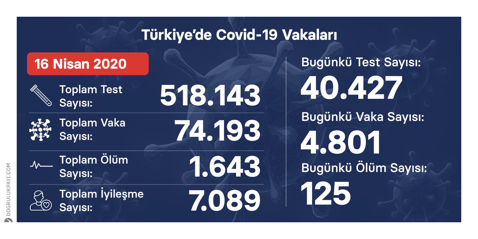 Bakanlık tarafından açıklanan resmi rakamlara göre 16 nisan günü ülke genelinde ki hastanelerde 320 bini aşkın koronavirüs testi yapıldı ve 63 bin 82 kişide vaka tespit edildi.